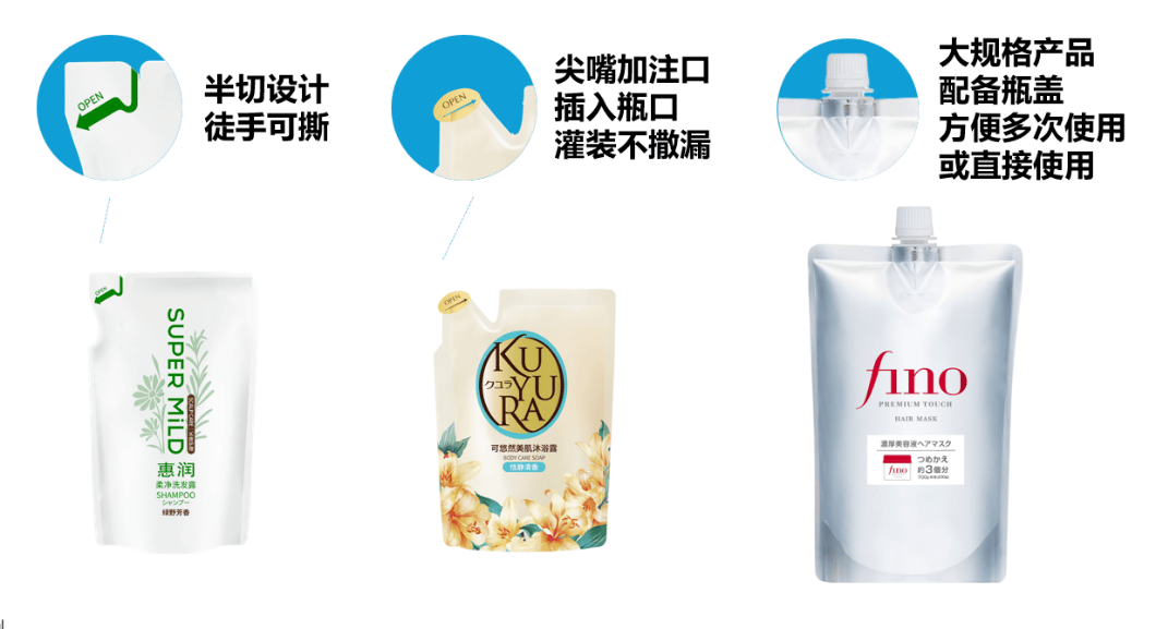调查显示,“容易洒漏”和“向瓶身灌装时易造成二次污染”是中国消费者对替换装产品接受度较低的因素之一,基于此痛点,FineToday菲婷丝也对替换装包装进行了针对性地设计,比如针对大规格的替换装,其使用了螺旋盖设计,以实现产品的多次使用和后续保存,而对于需要徒手撕开的替换装,其不仅有专门的易撕开设计,同时还采用了尖嘴注入口的设计,以保证消费者在使用时不会出现产品外溢洒漏的情况。