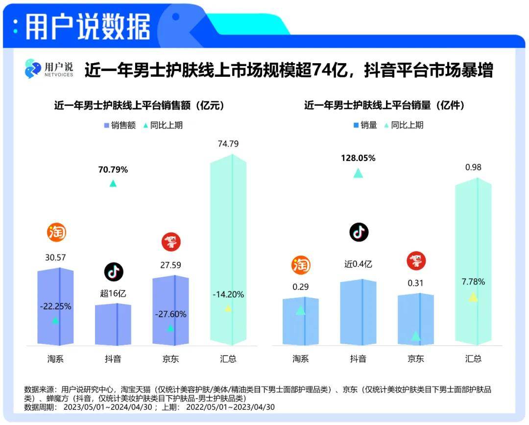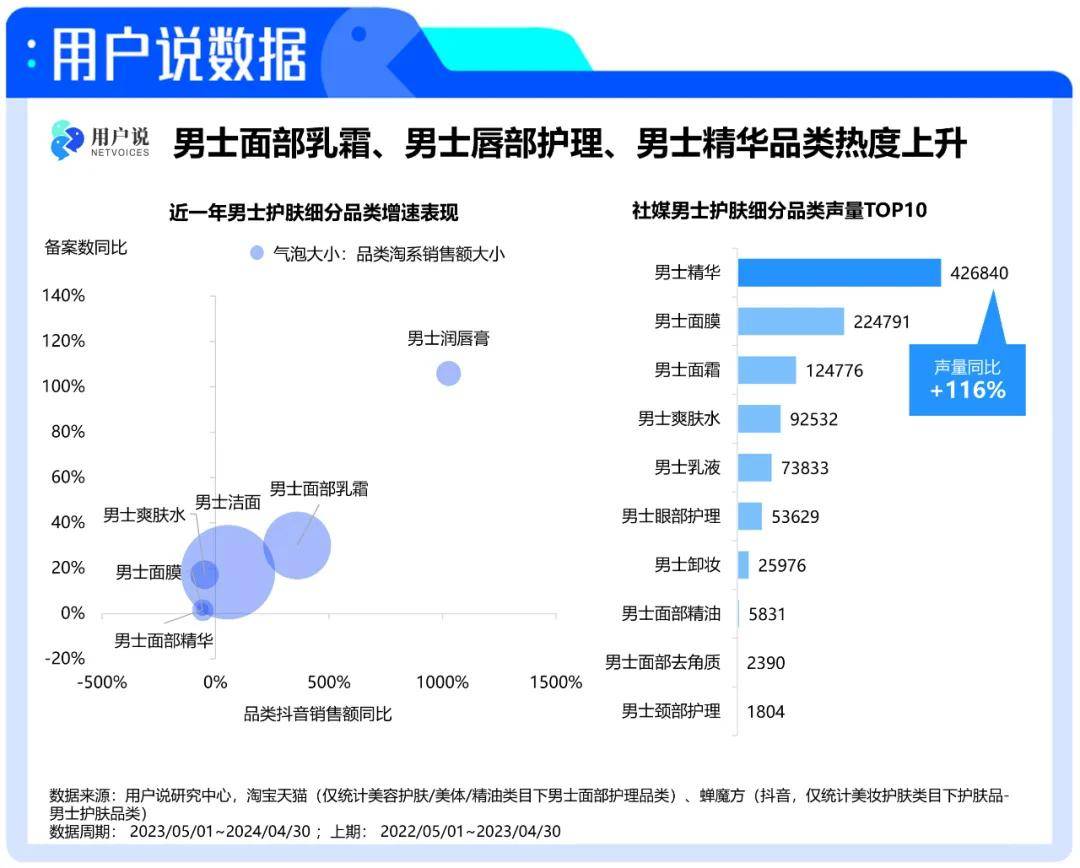 用户说数据显示,2023年5月至2024年4月男士护肤细分品类中,洁面品类