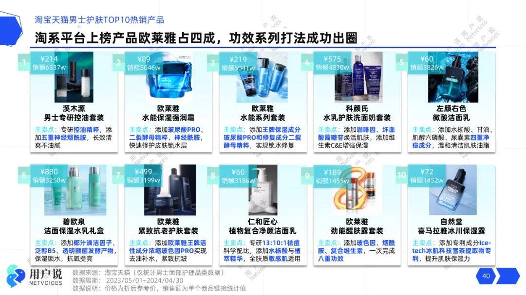 前文提及,欧莱雅以绝对的体量长期称霸了男性护肤市场,那么欧莱雅的产品凭什么打破同质化,精准抢占用户心智?根据用户说数据统计,2024.04MAT淘系、京东男士护肤TOP10热销产品中欧莱雅各上榜四席,上榜单品包括欧莱雅谁能保湿强润霜、水能系列套装、劲能醒肤露套装等,其中套装上榜率高于单品。作为目前男性护肤市场的领头羊品牌,欧莱雅始终致力于革新男士护肤品类,提供控油、劲能、保湿、抗皱