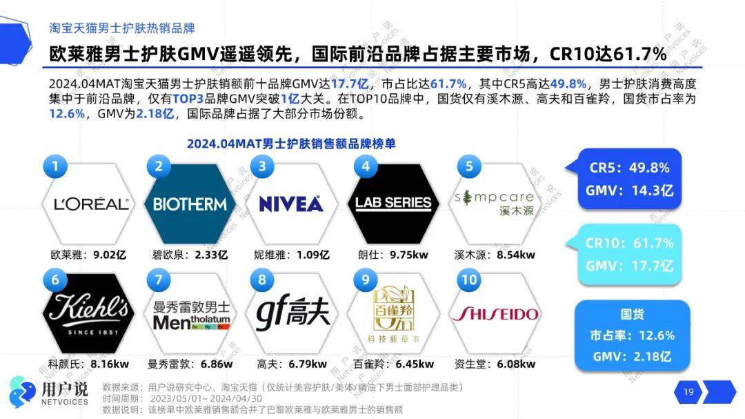 据数据显示,2024.04MAT淘系男士护肤销额TOP10品牌GMV高达17.7亿,