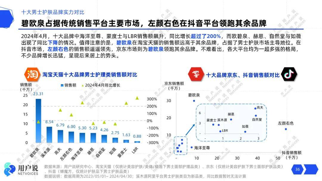本次报告的十大品牌中,既有垂直于男士专业护肤的一线品牌,也有极具潜力的新锐男士护肤国货品牌,其中销额成绩最亮眼的品牌为欧莱雅旗下的高端护肤品牌碧欧泉,2024.04MAT碧欧泉在淘系及京东平台男士护肤品类销额分别为2.33亿和3亿