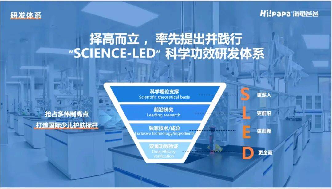 不仅如此,《报告》中还以海龟爸爸提出的“SCIENCE-LED”科学功效研发体系为例,提出企业应当建立更贴合少儿皮肤特性的研发体系,结合更广泛的基础数据库,打造更系统的研发体系。