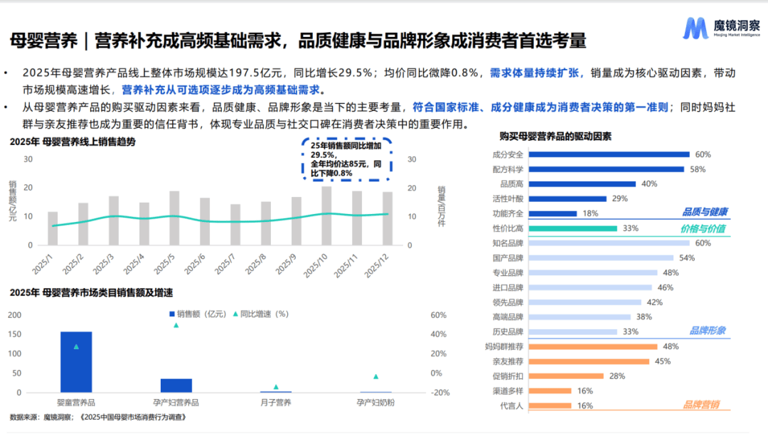 2025年母婴市场规模呈现稳健增长态势,线上市场表现尤为突出。线%的增速,且销量、均价高点集中在四季度,营养品和日用品类销售大幅提升。同时,线上渠道占比持续扩大,