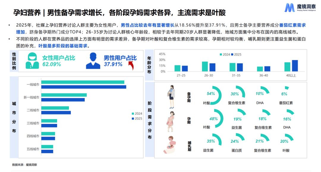 2025年男性在孕妇营养讨论中的占比从去年的18.56%大幅提升至37.91%,男性对备孕、孕期营养的关注度显著提高,“男性备孕”正成为越来越受重视的话题,地域方面集中分布在国内的高线城市。