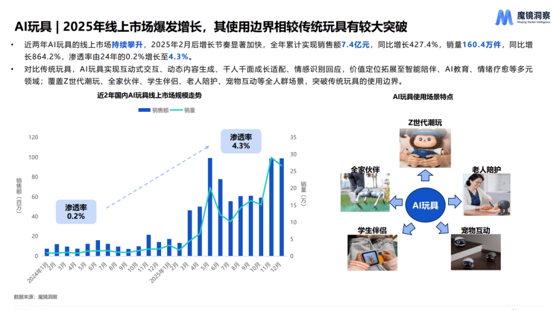——AI玩具。报告显示,2025年全年,AI玩具线.4万件,同比增长幅度更是高达864.2%。与此同时,其渗透率也实现了飞跃式的提升,由2024年的0.2%增长至4.3%