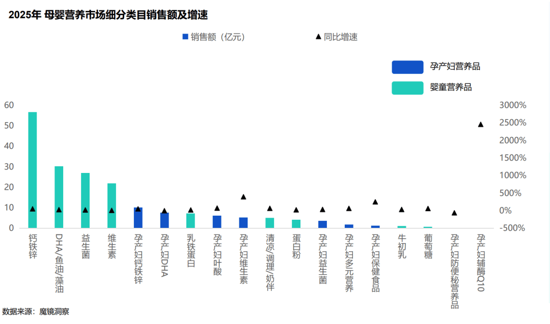 钙铁锌、DHA、维生素、益生菌及蛋白补充五大日常品类构成了市场的主要结构,这些产品已深度融入现代育儿日常,获得了极高的市场认知与消费惯性,基础营养补充正从可选消费品转变为新一代父母的育儿标准配置。