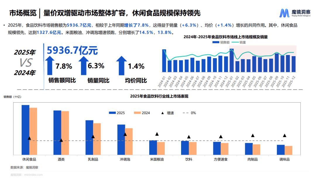 2025年,中国食品饮料市场整体规模达5936.7亿元,销售额同比增长7.8%,销量提升6.3%,均价上涨1.4%,量价双增带动市场规模上升。其中,乳制品作为传统核心品类,在健康消费趋势推动下,仍保持稳步增长。