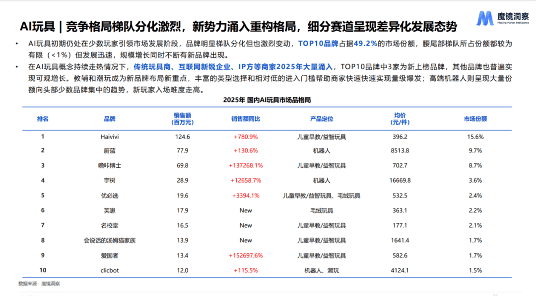 AI玩具市场中,AI机器人、AI潮玩以及AI教辅益智这三种常见的玩具类型表现尤为亮眼。2025年,它们的销售额均实现了大幅增长,同比增幅分别达到了181.5%、1465.9%以及639.8%。从市场需求层面来看,教辅需求以及成长陪伴需求已然成为中国用户在选购AI玩具时的核心考量因素。基于此,教辅类和潮玩类AI玩具成为众多新品牌布局市场的重点方向。这两类玩具不仅在产品类型上极为丰富,能够满足不同用户的多样化需求,而且相对较低的进入门槛也为商家带来了便利。
